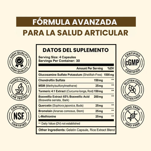 Nuestra Fórmula Avanzada para la Salud Articular combina Glucosamina, Condroitina, MSM y Cúrcuma en una sinergia potente que ayuda a proteger tus articulaciones, apoyar la regeneración del cartílago y reducir la inflamación de manera natural.